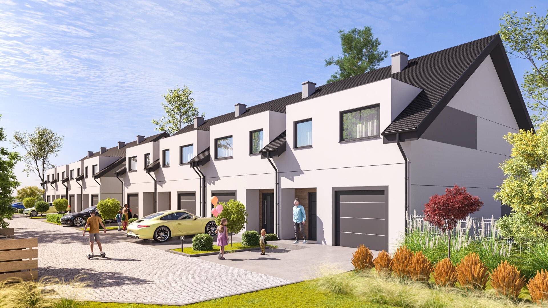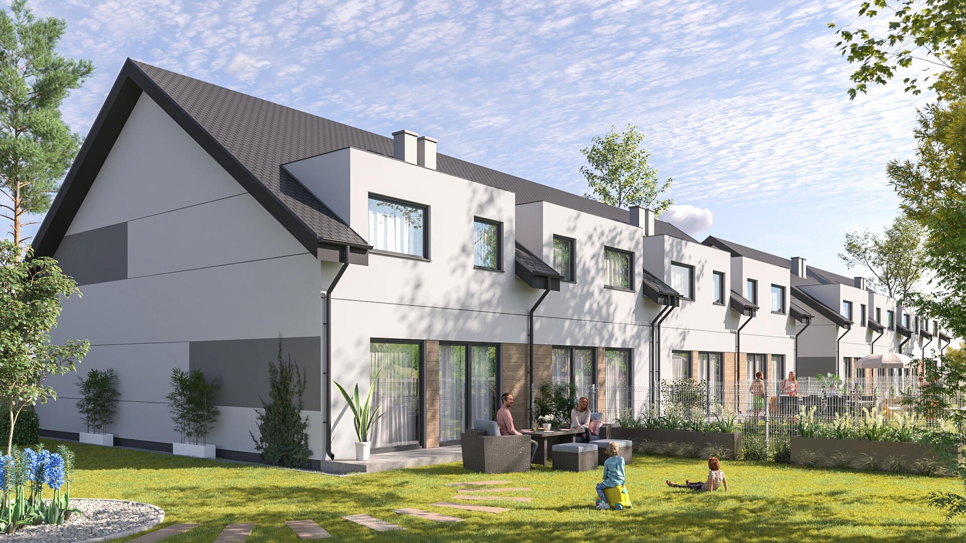 Inwestycja to cztery domy w zabudowie bliźniaczej z garażami oraz dużymi ogrodami.